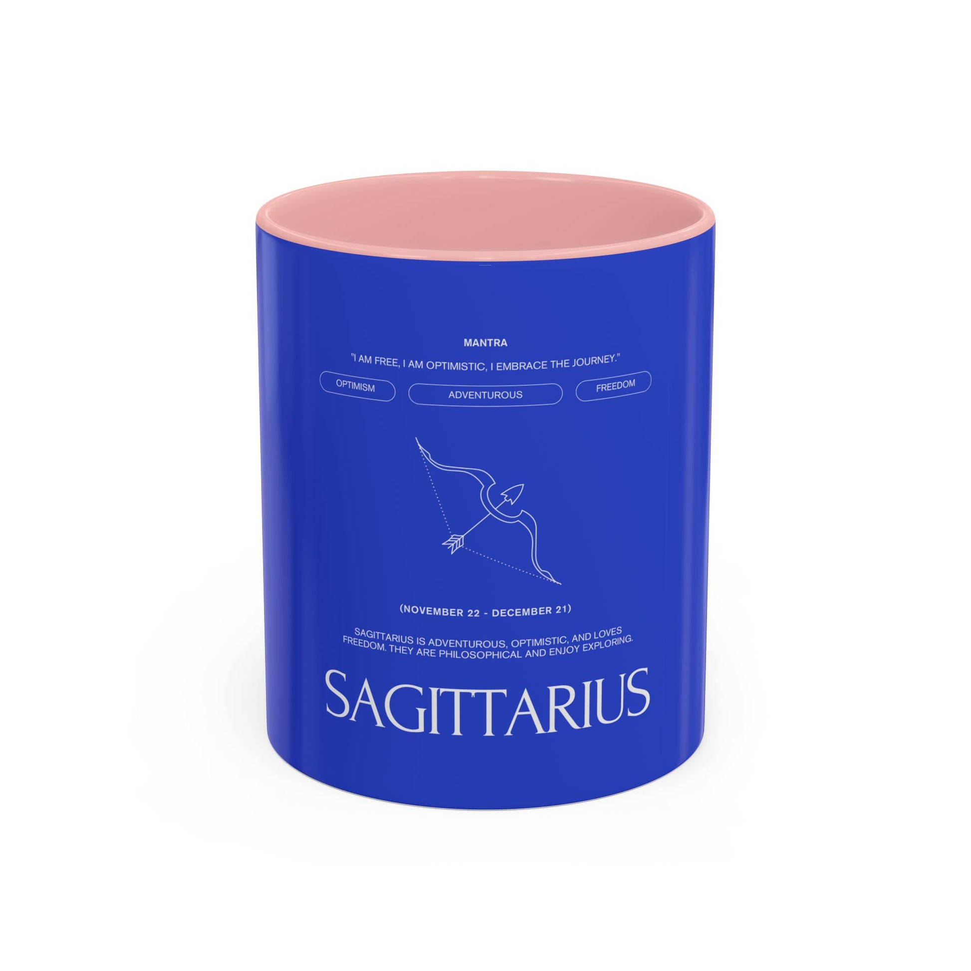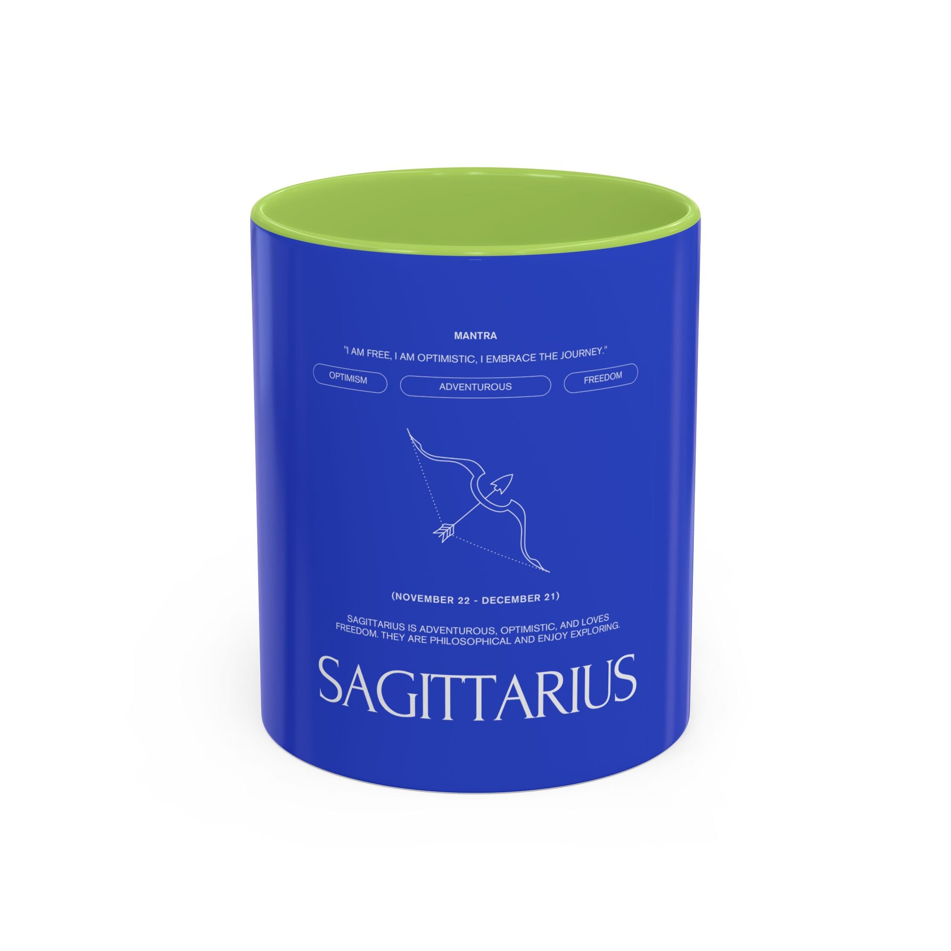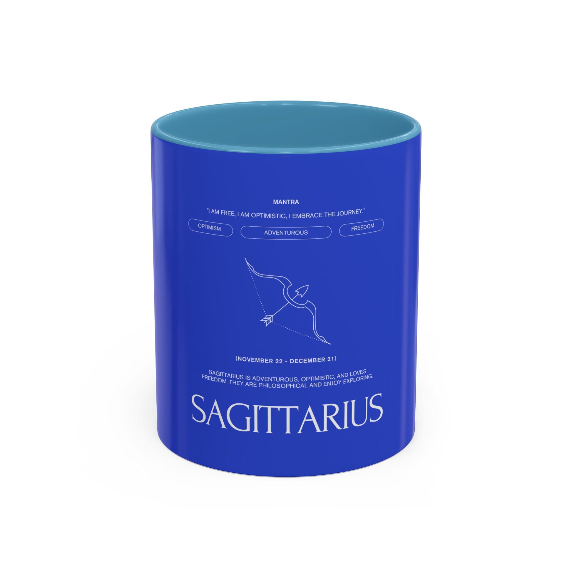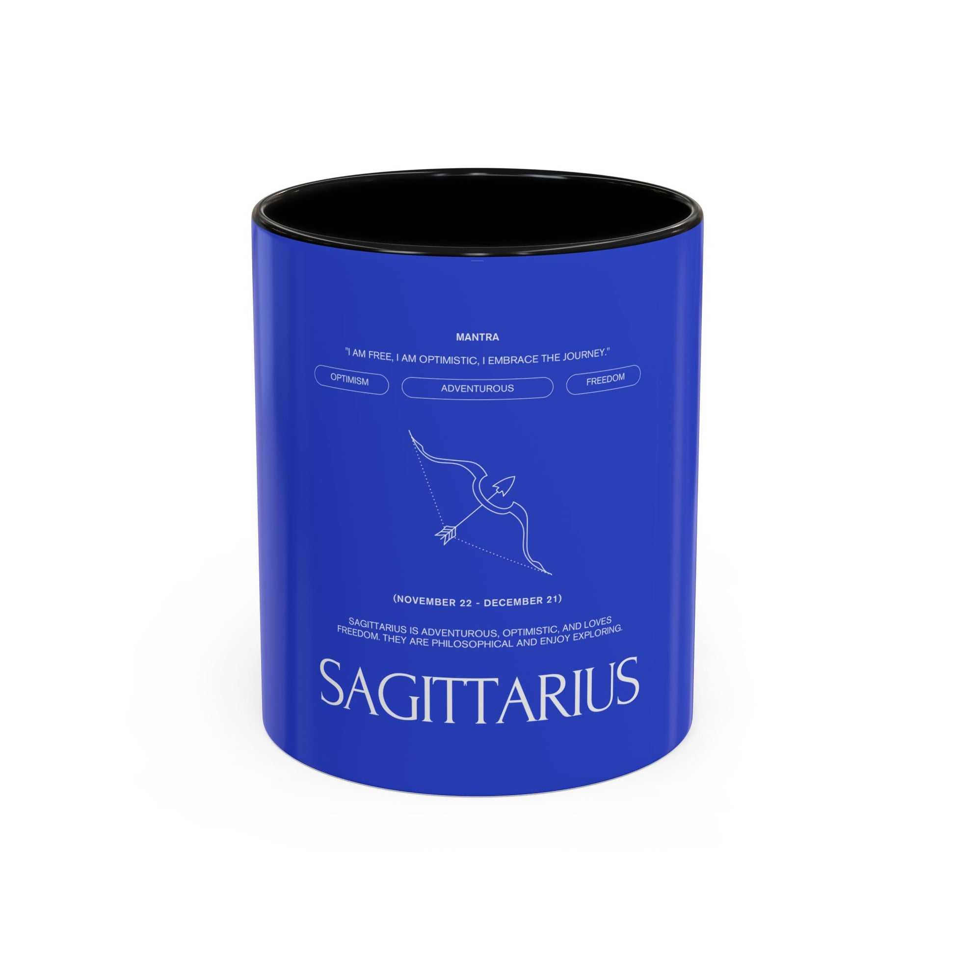 Deep blue ceramic mug with a bold black interior and handle, stamped with a minimalist Sagittarius archer and clean typographic zodiac label. It feels like a private ritual—morning coffee against a cool cobalt backdrop, the small constellation sketch nudging you toward new plans and late-night dreams. The design sits quietly confident on your desk or kitchen shelf, speaking to restless explorers who map their days by curiosity and conversation. Bring it out during cozy astrology nights, birthday breakfasts for late-November souls, or when you need a steady companion for planning trips and jotting down big ideas.